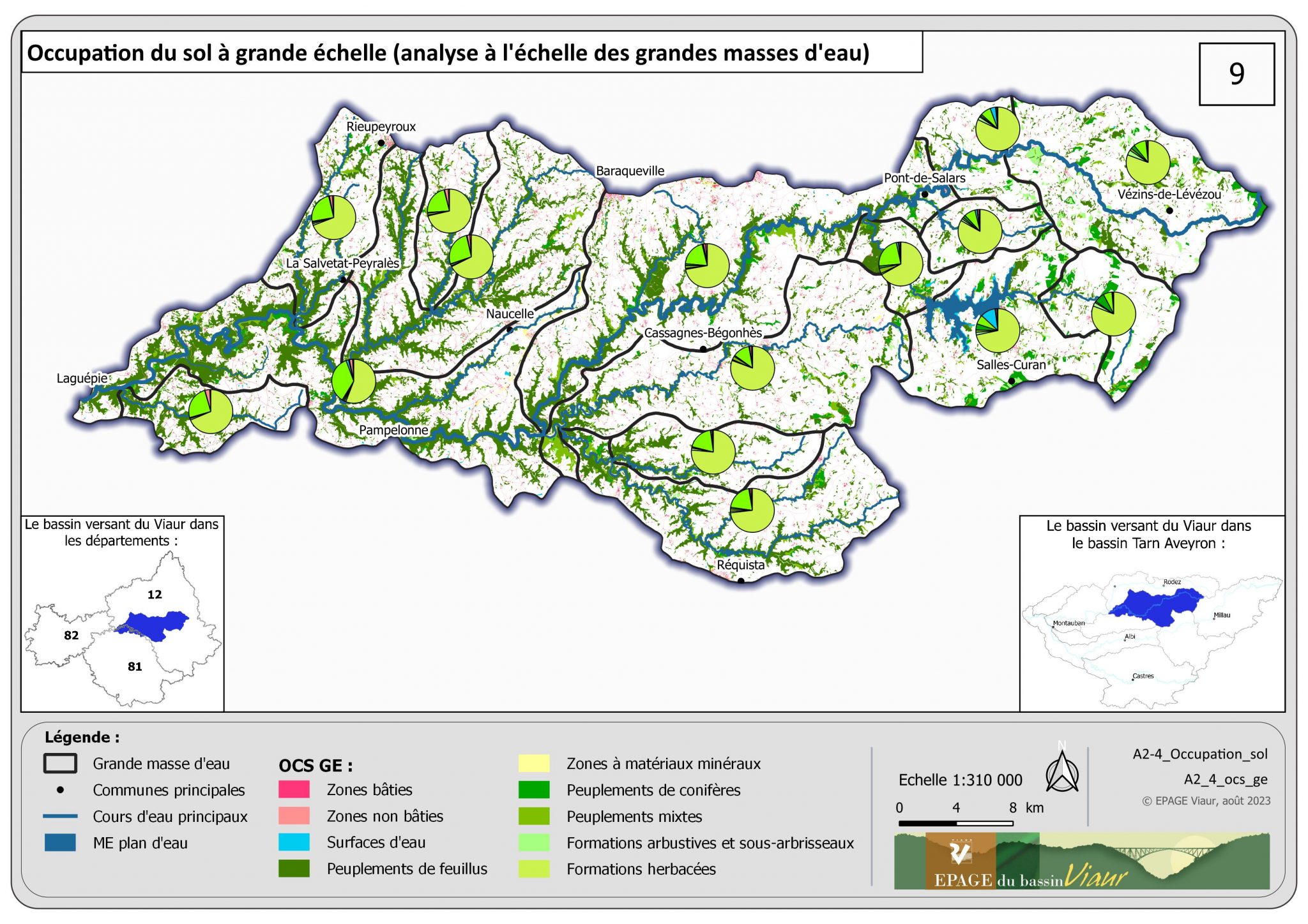 Sur le Lévezou, les surfaces agricoles occupent 86% du territoire alors que sur la partie aval du bassin versant du Viaur, elles ne représentent plus que 66% laissant la place à des surfaces boisées plus importantes (33% – forêts de feuillus) notamment sur les pentes.