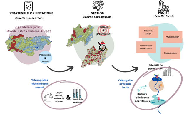 Le travail mené sur la thermie a conduit à l’édification de valeurs-guides permettant de caractériser, les altérations du régime thermique des cours d’eau en lien avec la présence de retenues. Il est considéré 3 échelles spatiales : à l’échelle du bassin versant, de la retenue, et du linéaire de cours d’eau en aval.